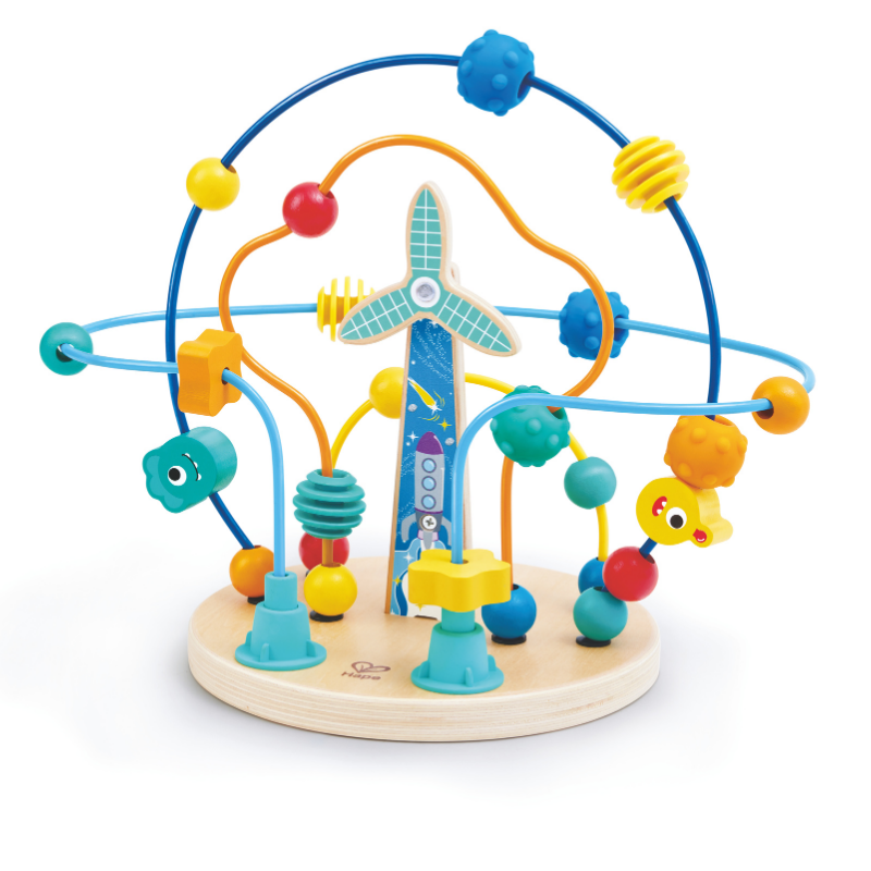 El laberinto de cuentas presenta un emocionante diseño espacial con cuentas con forma de extraterrestres y planetas, invitando a los niños a una aventura extraterrestre.