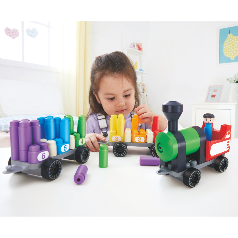 ¡Aprende los colores y a contar mientras juegas con este kit de locomotora de vapor! Incluye todo lo necesario para construir el tren y un montón de bloques de colores.